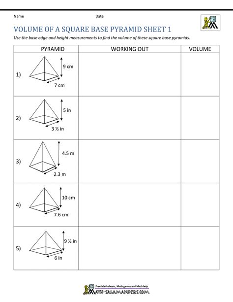 Web volume of a square pyramid worksheets, geometry worksheets for 4th grade, 5th grade and middle school Web formula to find volume of pyramid is = (1/3) x base area x height. Web printable worksheets @ www.mathworksheets4kids.com name :